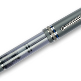The limited edition Delta Prestige Matte fountain pen has a translucent grey barrel, complemented by a matte grey resin cap, grip, and removable blind cap. It has an internal piston mechanism, ruthenium-plated trim, a large blue ebonite feed, and an oversized ruthenium-plated #8 JoWo 18k gold nib.