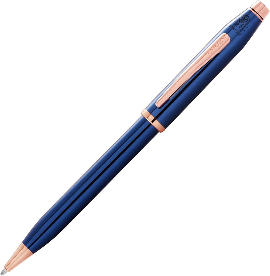 This pen features a polished translucent blue barrel and cap, with 23k rose gold plated accents.