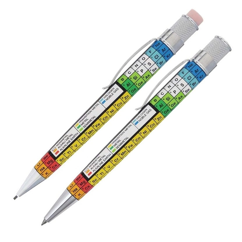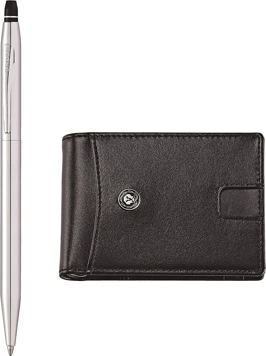 The gift set features a polished chrome click ballpoint pen and black leather wallet