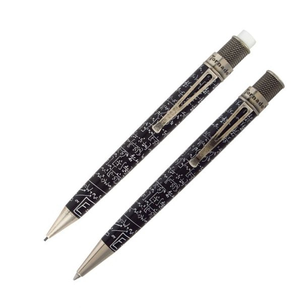 The Albert pen and pencil gift set features a matte black lacquer finish over stainless steel, accented with antiqued trim, and Einstein's equations written in white. The most recognized one being the mass-energy equivalence equation: E=mc2. The pen comes loaded with a rollerball refill, and pencil with a 1.15mm lead. They both operate with a simple twist of the top, plus there is a a huge eraser on top of the pencil for those who make an occasional mistake. Each set comes packaged in a graphic tube with extra lead and erasers.