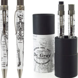 This Dr. Gray gift set features an illustration of a skeleton in honor of Dr. Henry Gray, and his book on the human anatomy. With a rollerball pen and 1.15mm pencil, they both operate with a simple twist of the top, plus there is a a huge eraser on top of the pencil for those who make an occasional mistake. Each pencil comes packaged in a graphic tube with extra lead and erasers.