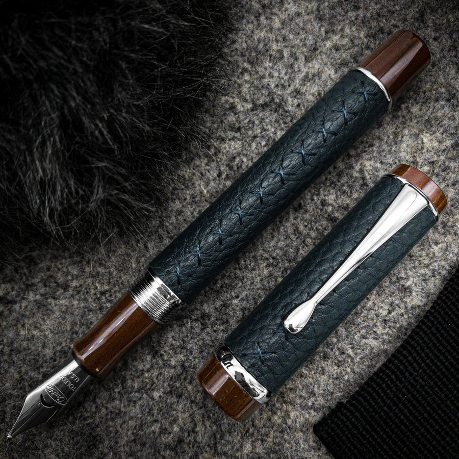 The Duragraph Savoy combines elegance, cutting-edge design, and functionality that uplift the writing experience. The perfectly sized barrel is covered with blue high-quality textured leather that is soft to touch yet very durable. The leather is decorated with handmade, high-end cross-stitching along the barrel adding additional strength and complementing the overall look. The cap with brown resin accents completes the exquisite look. Lustrous chrome plating adorns the clip, band, and trim, enhancing the elegance of each pen. The cap top is embellished with the Conklin® Est. 1898 logo.